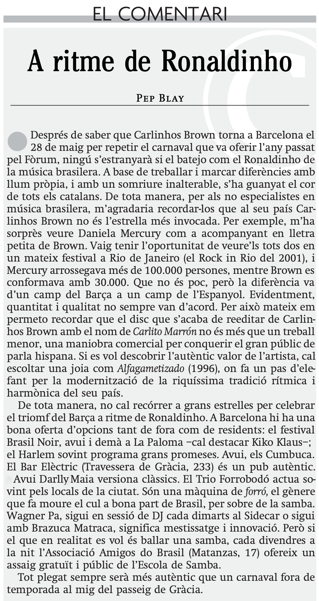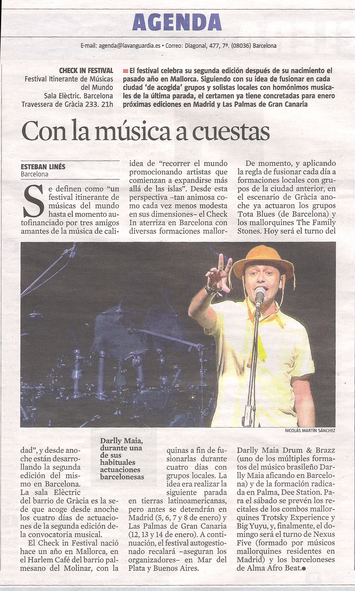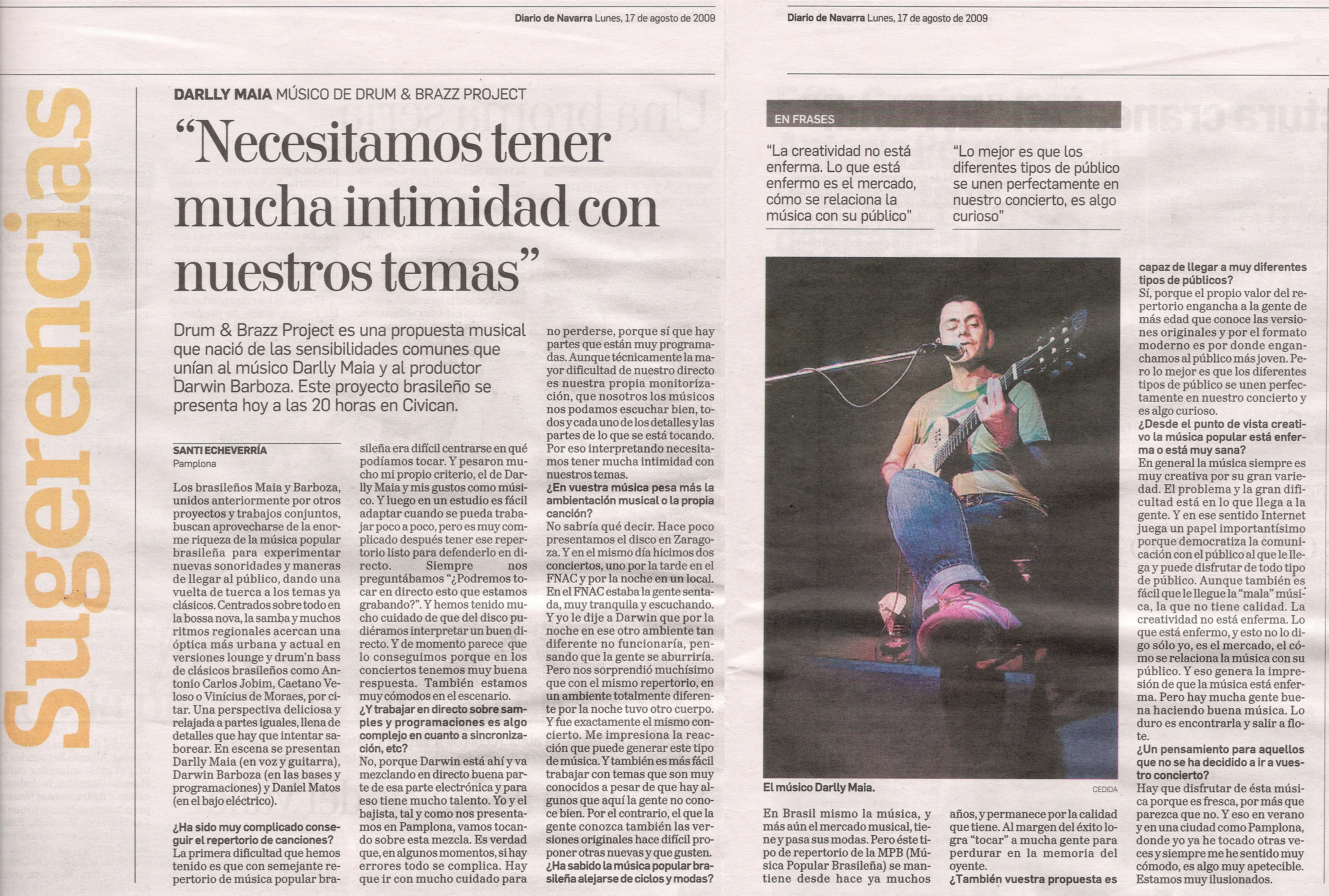 PRESSE La Vanguardia lire L'Express lire Journal Migros lire Journal Ville de Neuchâtel lire Programa Pachamama - RNE écouter TV3 - Programa Millenium regarder Diario de Navarra lire Diario ADN lire Revista Brazil com Z lire Programa Catalunya Plural écouter Periódico Provincia lire iCat FM écouter TV33 - Programa El Master regarder El Periódico lire Programa Caminantes écouter La Vanguardia - El Viernes lire Diari Avui lire Revista Boom lire "Eu, músico." - Film regarder